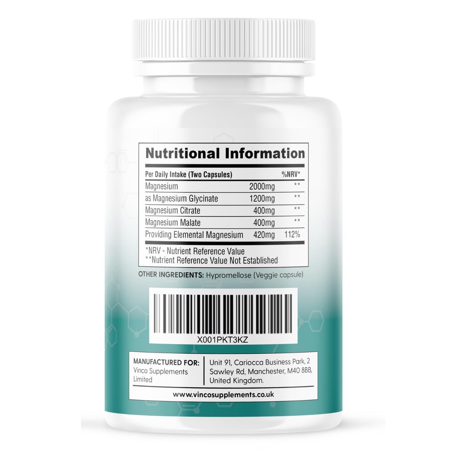 Brand: Vinco Supplements Features: SUPERIOR TRIPLE MAGNESIUM COMPLEX: Our Vinco Magnesium Glycinate 3-in-1 Complex is a unique blend of magnesium bisglycinate, magnesium citrate, and magnesium malate. Each Serving delivers a substantial 2000mg dose, including 420mg of elemental magnesium for max...